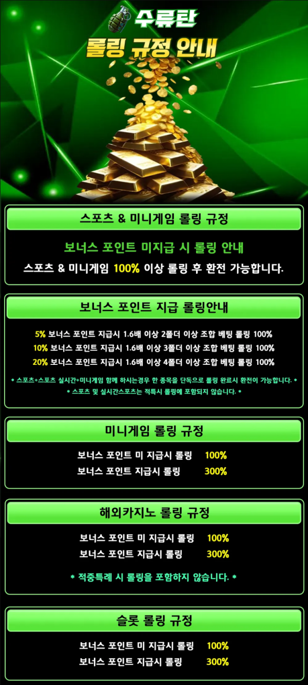 5% 보너스 포인트 지급시 1.6배 이상 2폴더 이상 조합 베팅 롤링 100% 10% 보너스 포인트 지급시 1.6배 이상 3폴더 이상 조합 베팅 롤링 100%