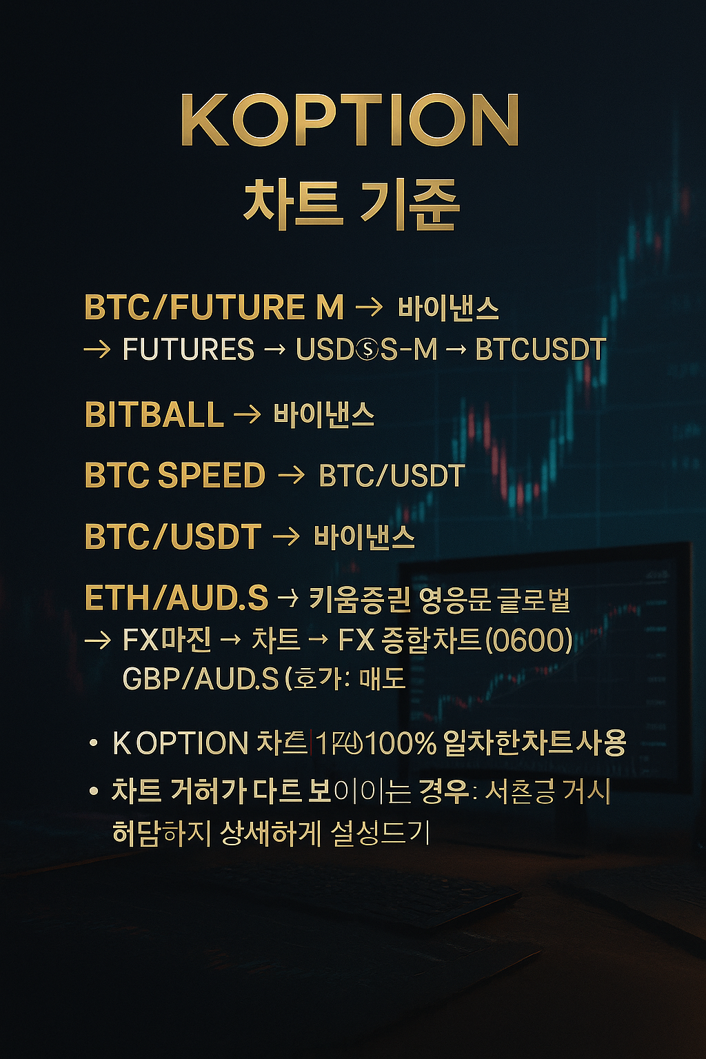 저희 K OPTION 거래소는 키움증권, 바이낸스 100% 일치하는 차트를 사용하고 있습니다.