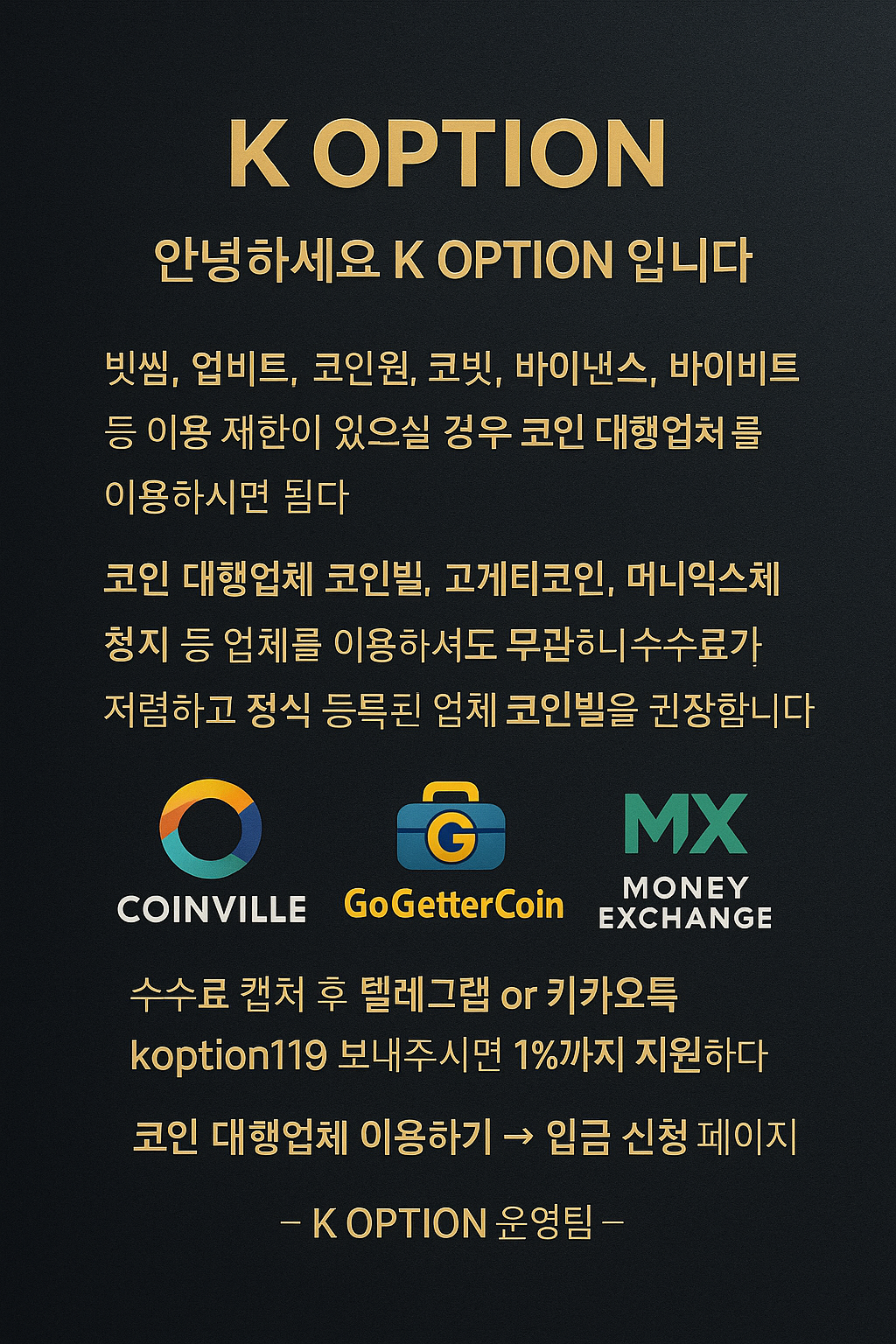 업체를 이용하셔도 무관하나 수수료가 저렴하고 정식 등록된 업체 코인빌을 권장합니다